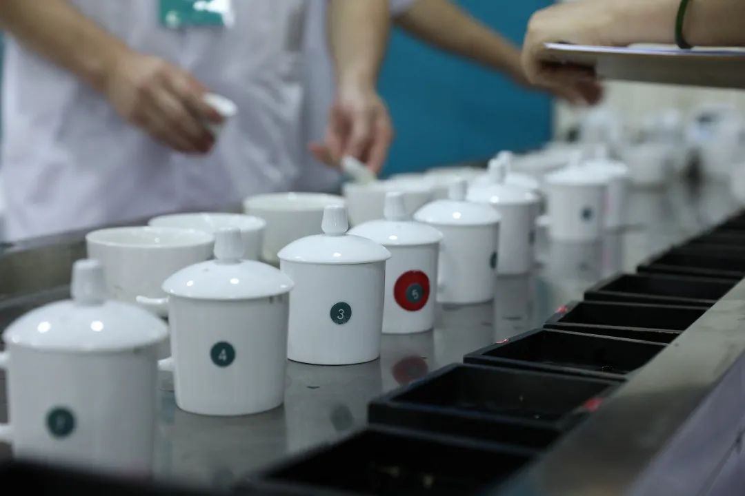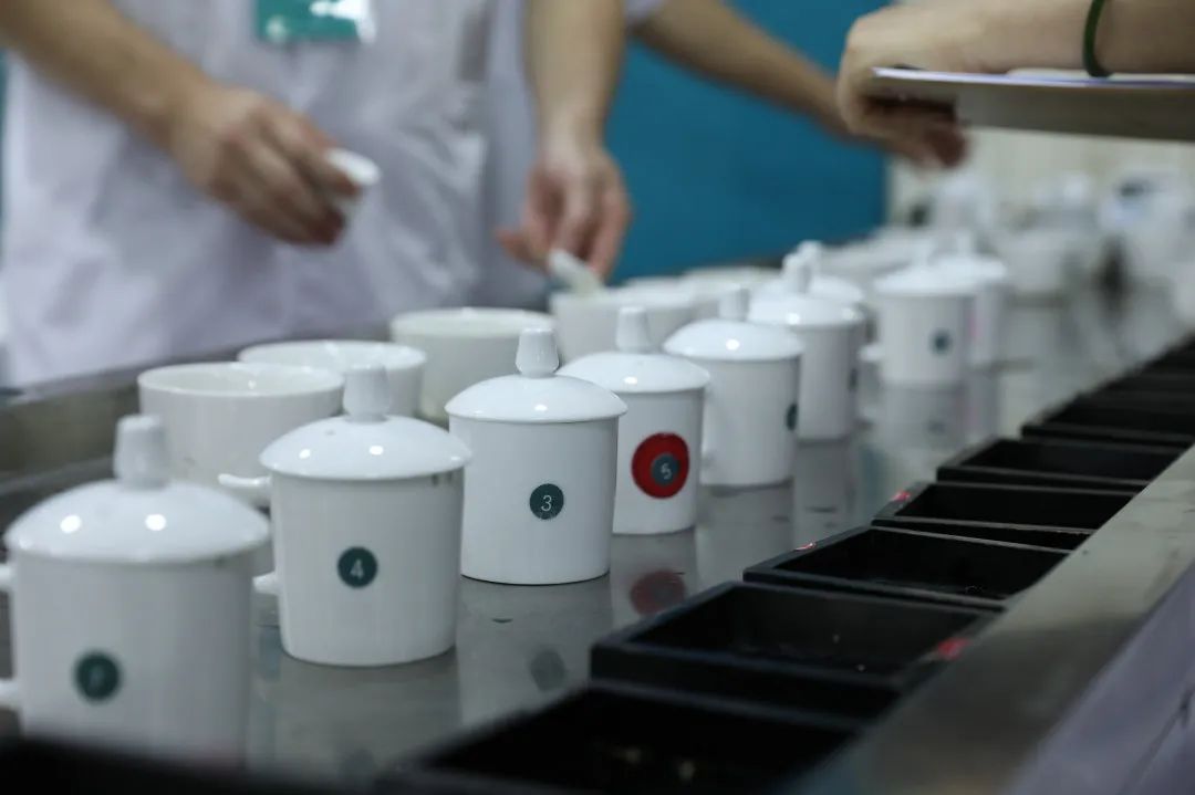 从观赏茶叶的叶态、色泽、匀净度再到热嗅闻香、观茶汤的色泽、明亮度和清澈度,接着用勺子品饮感受茶汤的纯正,鲜度,苦涩等,最后看叶底的柔嫩、柔韧度、匀整度及光泽度。每个步骤都严谨细致。