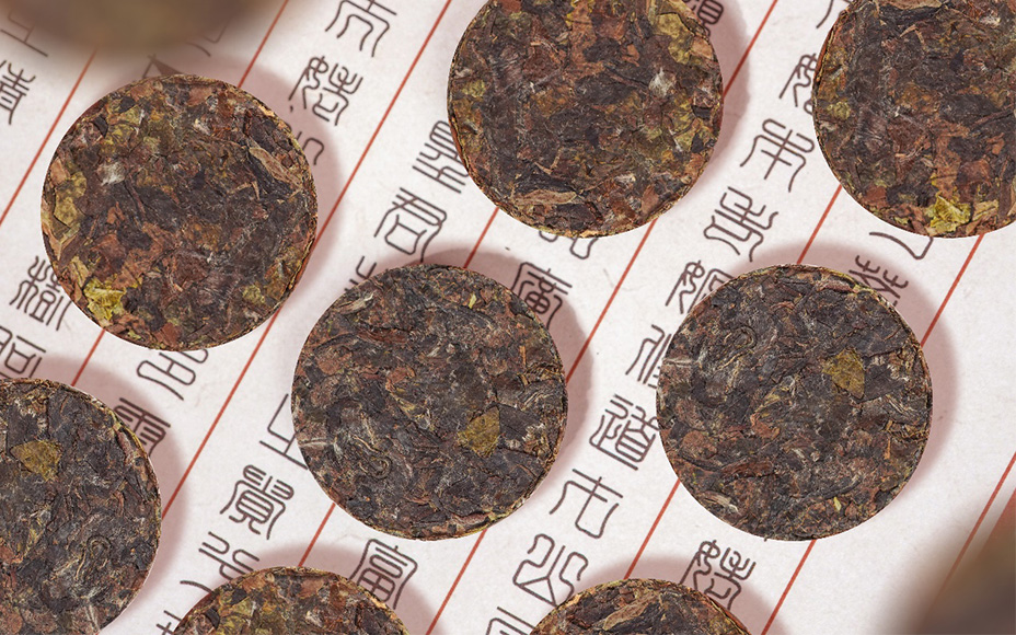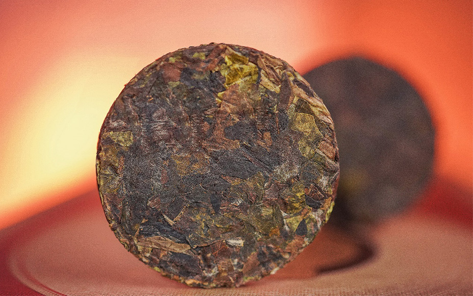 干茶:呈小圆片形,叶张肥厚,芽叶连枝。叶面灰青绿,叶脉微红。