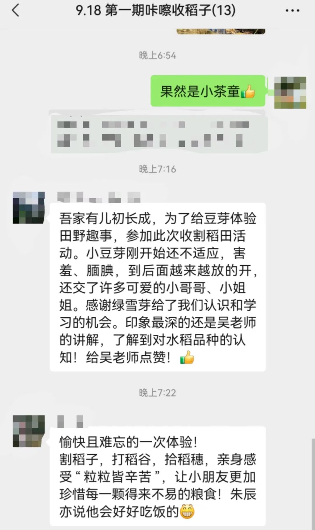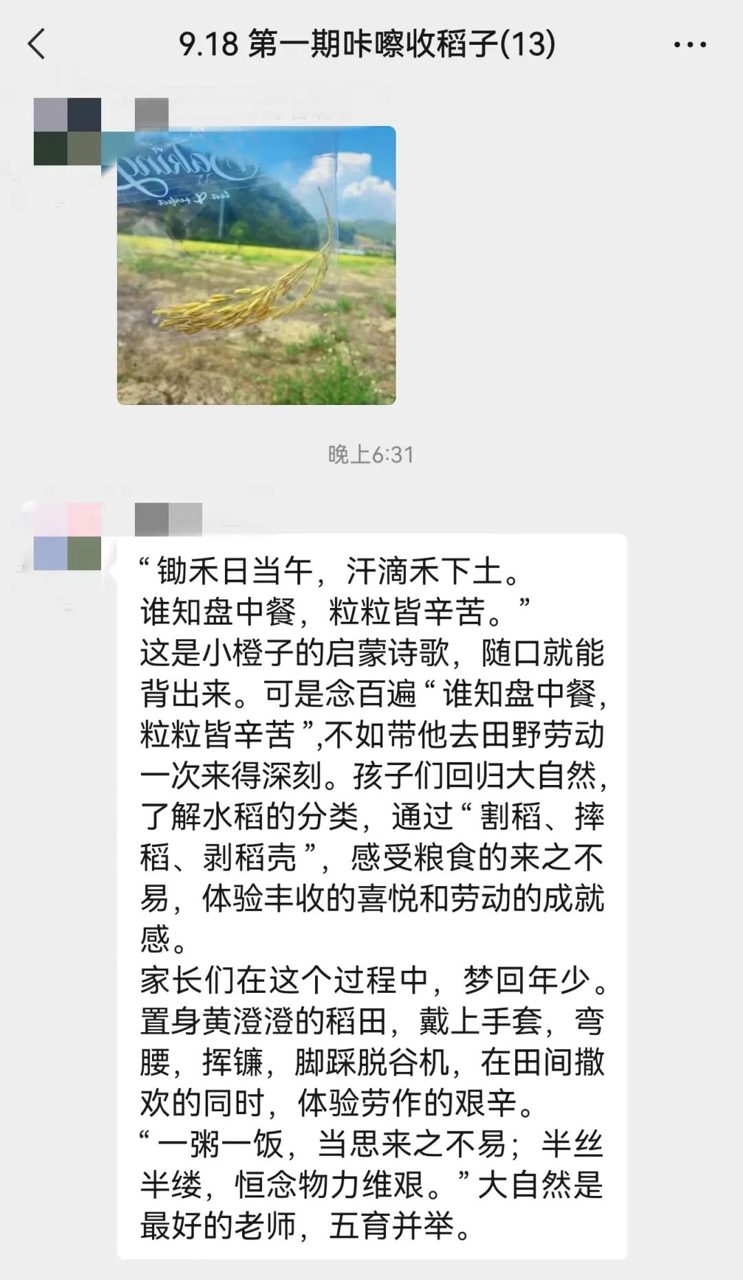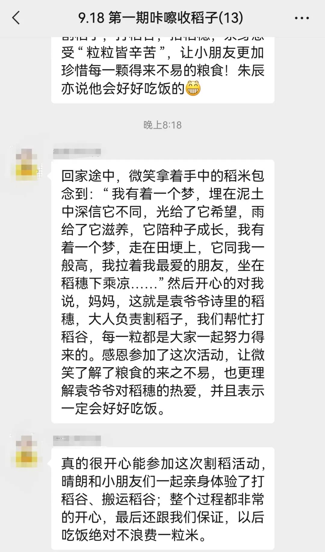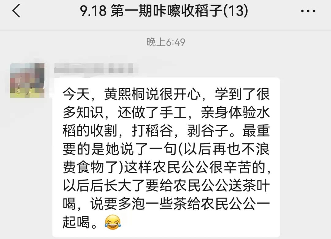 孩子们和父母既一起体验了打稻谷的过程,又体会到了“粒粒皆辛苦”的悯农之辛。