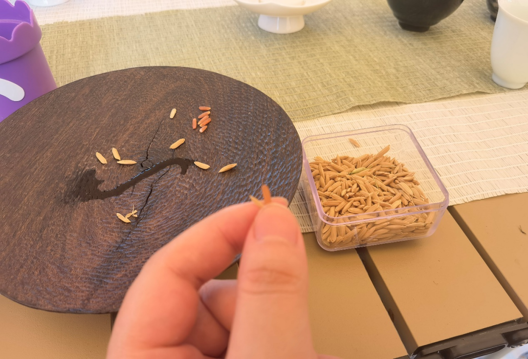 吴老师在农事小课堂中介绍了水稻种类分为梗米,籼米和糯米,而这里包括了所有种类,具体为红米,长梗米,短梗米,和糯米四个品种。按照播种期分为早稻,中稻,和晚稻,大爱农场种植的稻米种植于晚期,每年一期,生长周期需要145天,而不是常见的一年两期,这样的水稻生长周期仅有90天。大爱农场的水稻秸秆中储存的养分更多,营养价值更高,物质组成更细化,表现出来会更好吃,更香甜味美。我们的太姥山绿雪芽白茶庄园自产的就是红米。此外,吴老师还介绍,水稻除了可以食用以外,还可以用来酿酒,打米糕等。