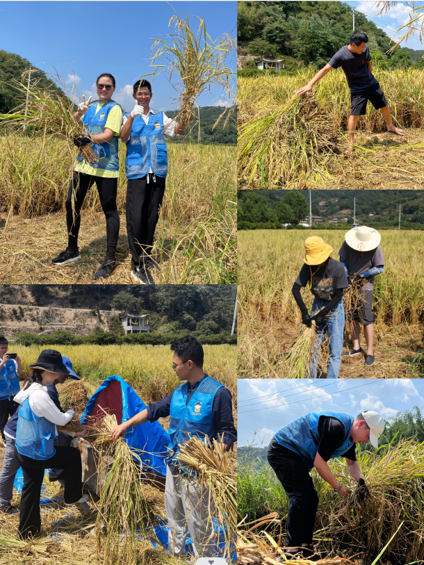 吴老师介绍完,大家分别开始劳动。用镰刀收割水稻倒是不难,但是割下来之后择取几根稻子,缠绕一圈,再塞进去的捆绑方式没体验学习过还真的是不会。还有摆放的方式也是,需要交错相交摆放,而不是整整齐齐地叠放。