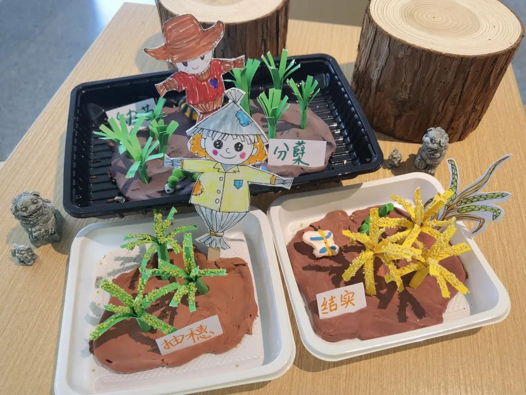 孩子们虽然错过了“五月“的插苗,但是”消消乐“妈妈的手作景观盆展示了”幼苗-分蘖-抽穗-结实”的全过程,风吹稻浪,招呼着大人带着孩子们来丰收。另外,孩子们用地上的小石子,稻穗,带来的动物玩具等搭建了主题感官盆。