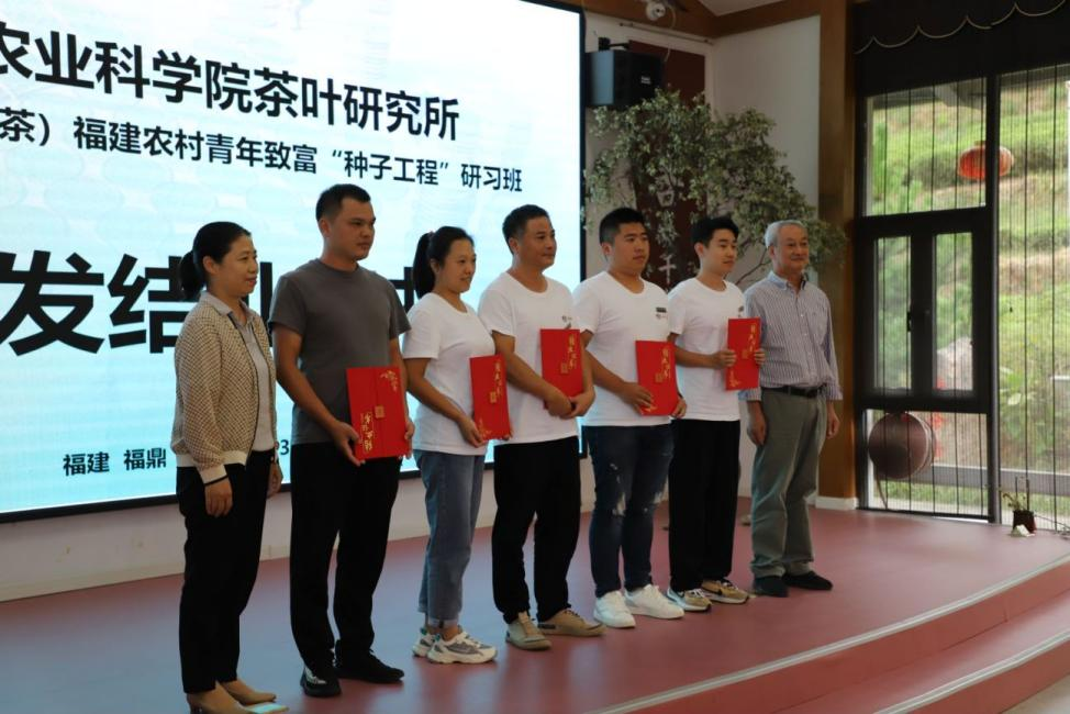 9月27日,研习班迎来结业典礼。福建省关工委副主任张伟光、宁德市关工委主任李过渡、中国农业科学院茶叶研究所茶业科技信息中心主任翁蔚、福建省关工委办公室主任邱雪芳、农业农村部茶叶指导组专家高峰、福建省茶叶质量检测中心站原站长陈金水、福建省关工委农业委副主任郭雅玲、福建省商贸学校培训与鉴定办主任高宝荣等领导和专家,以及承办单位福建绿雪芽茶业有限公司林鼎峰副总经理,支持单位福建裕荣香茶业有限公司董事长蔡良绥、福鼎市永德益茶业有限公司董事长王海堂出席结业仪式。