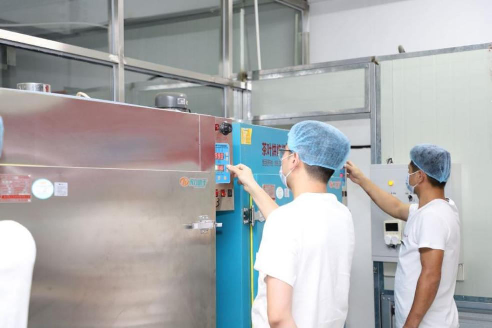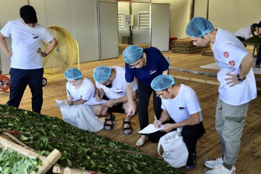 在制茶实操教学环节,导师为同学们演示白茶摊青、并筛、烘干等加工流程,详细讲解各个加工工序的要点。在导师们手把手带领下,学员们一丝不苟地操作练习,定时观测记录茶叶的变化。