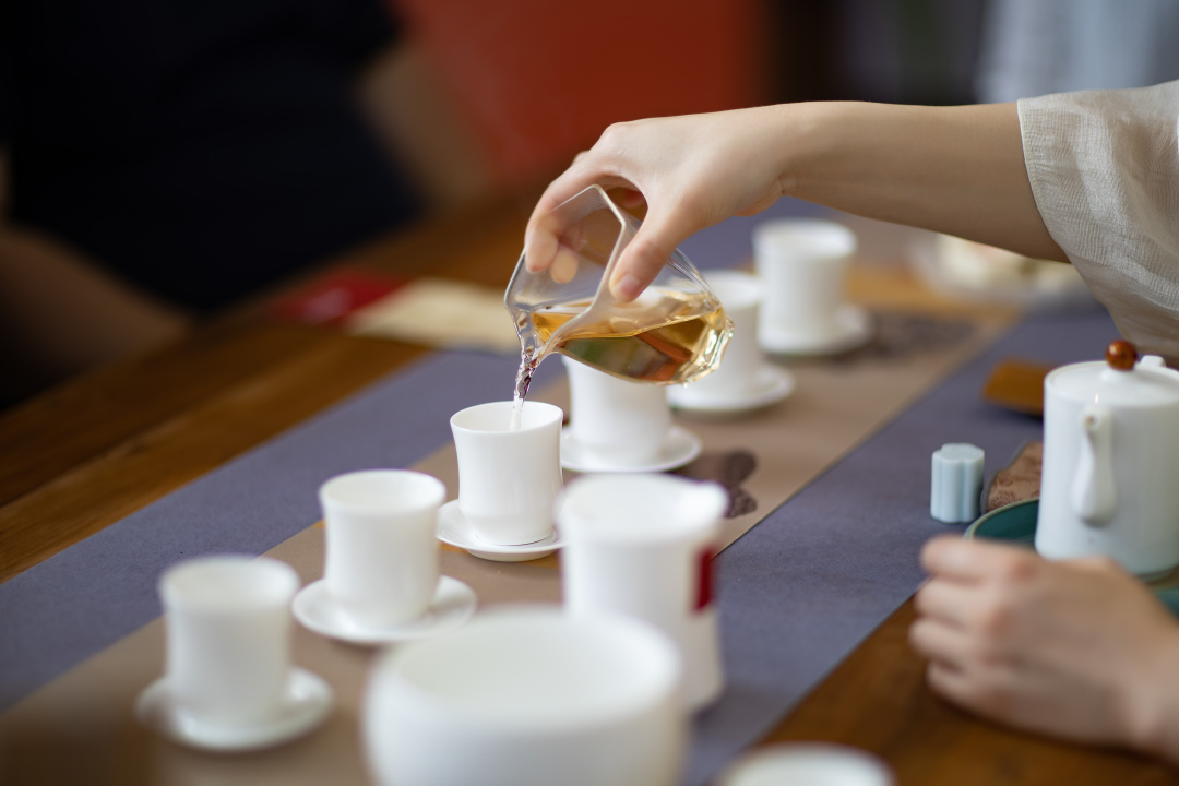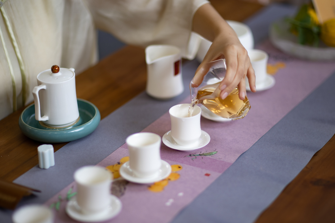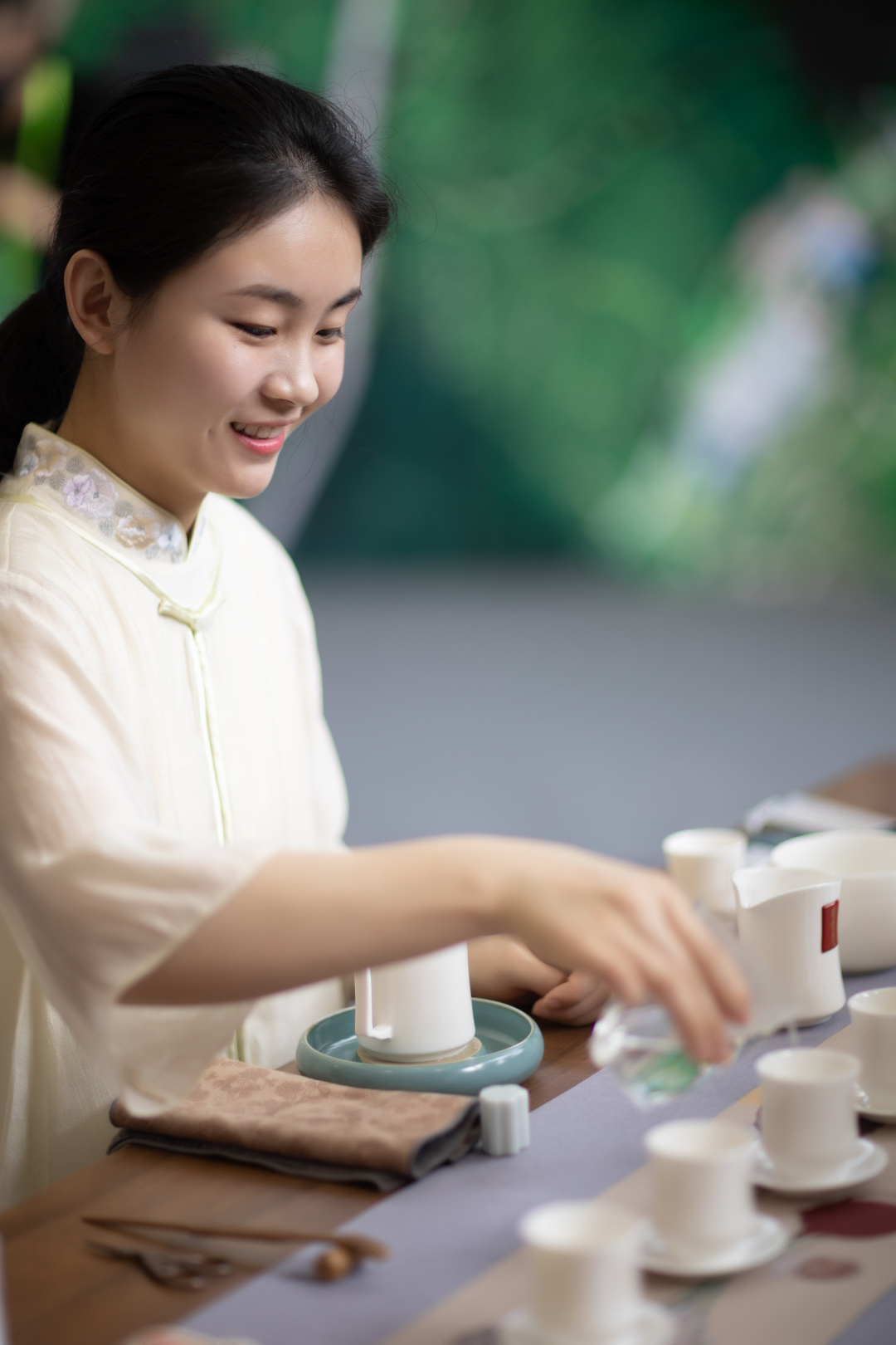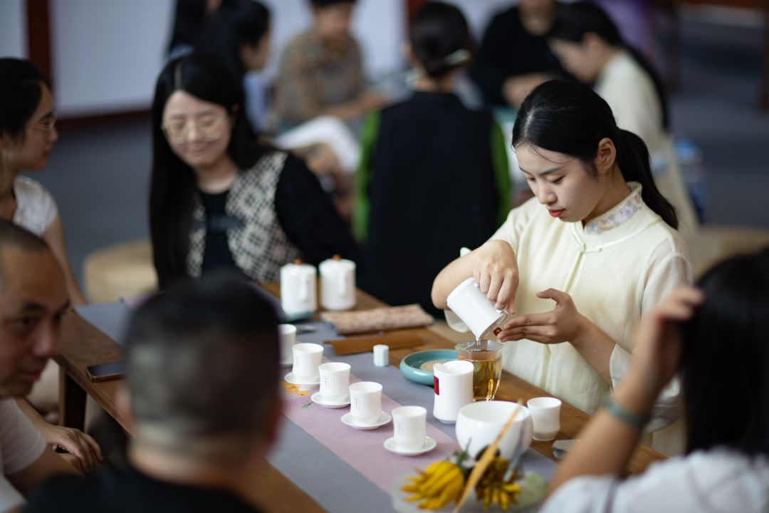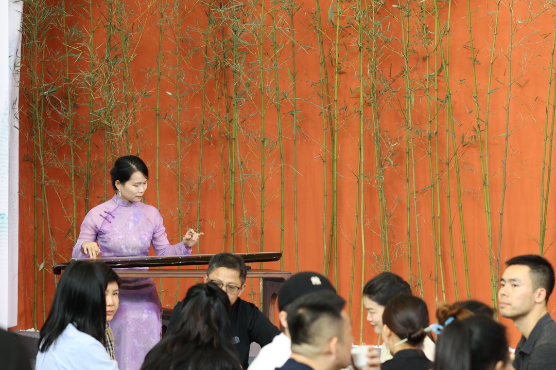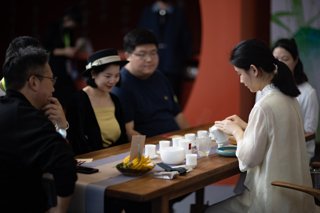 一壶白茶,绿竹疏影,曲水流觞。茶味与琴声合二为一,宾客们轻声交谈、品茗,别是一番雅趣。