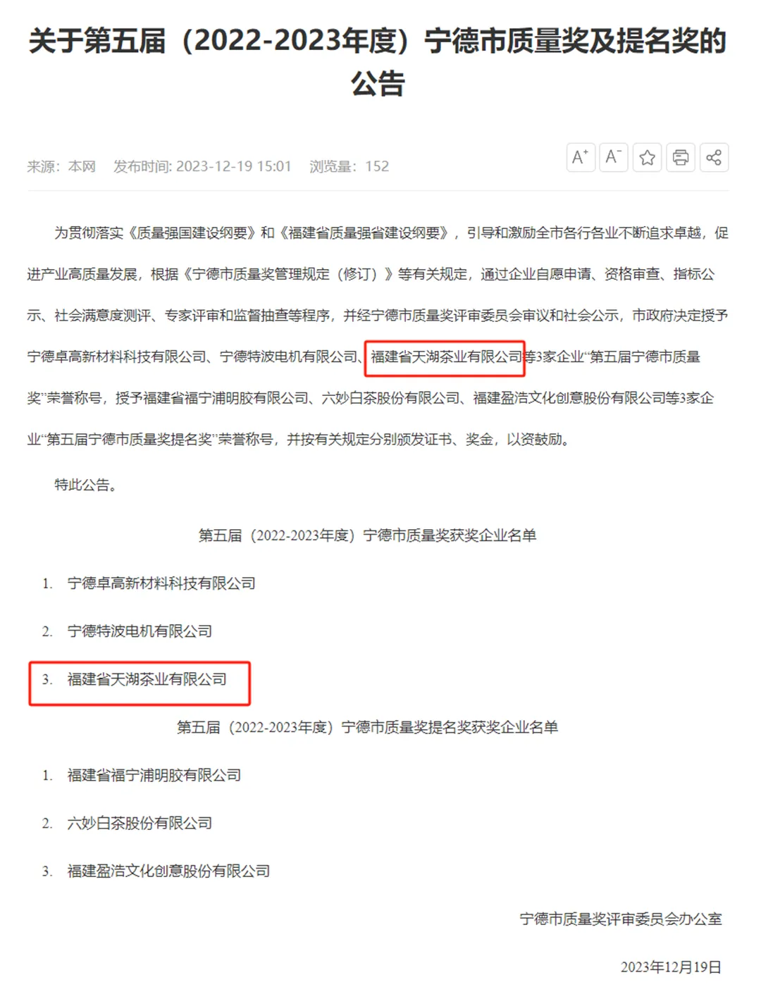 热烈祝贺福建省天湖茶业有限公司荣获第五届宁德市质量奖!