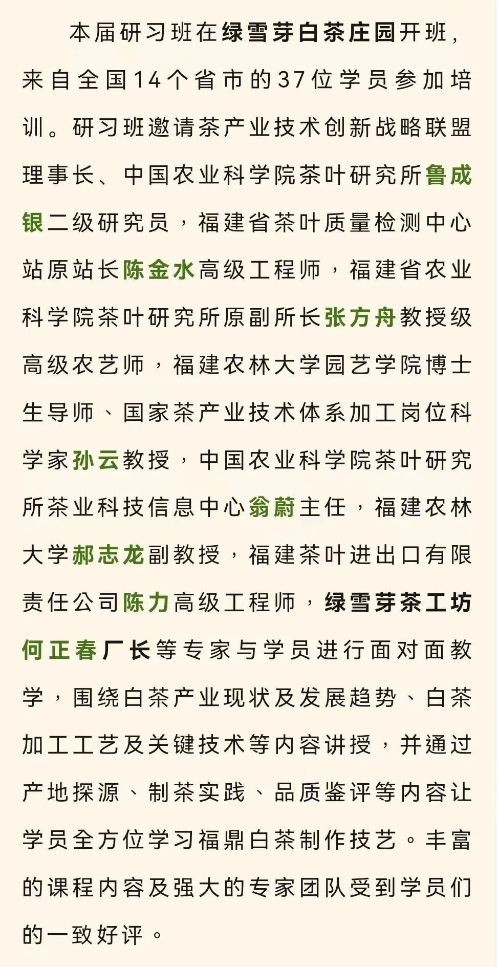 第四届福鼎白茶制茶师研习班圆满完成,这是绿雪芽白茶庄园第四次协办中国茶科所高级制茶研习班。主办方、授课专家老师及参训学员对庄园生态环境及其提供的专业场地(实操、授课)和后勤保障工作给予充分的肯定。