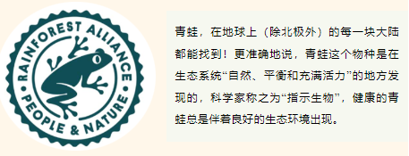 加入雨林联盟可持续农业项目的农场和企业在产品上使用专有标识图案——小青蛙印章,帮助消费者识别可持续的产品。