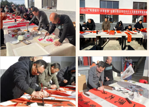 现场镇民俗文化艺术协会和市文联文艺小分队的书画家,义写春联和书画年历赠送村民,并将提前准备好的150副春联随下村慰问队伍带到各村,入户送"福"送春联,为广大村民送去新春祝福。