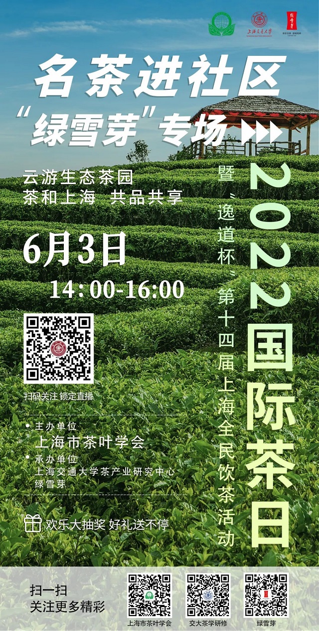 可观可品,与茶相伴。2022国际茶日暨“逸道杯”第十四届上海全民饮茶活动——名茶进社区“绿雪芽”专场在直播间等你!